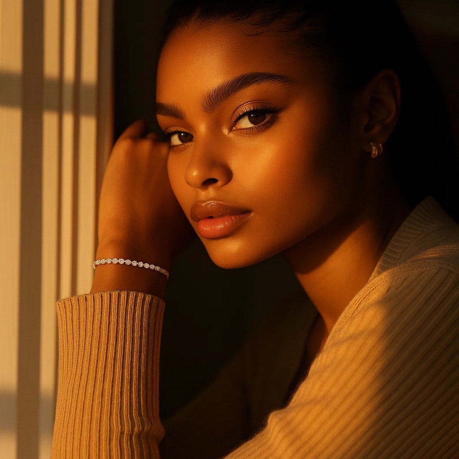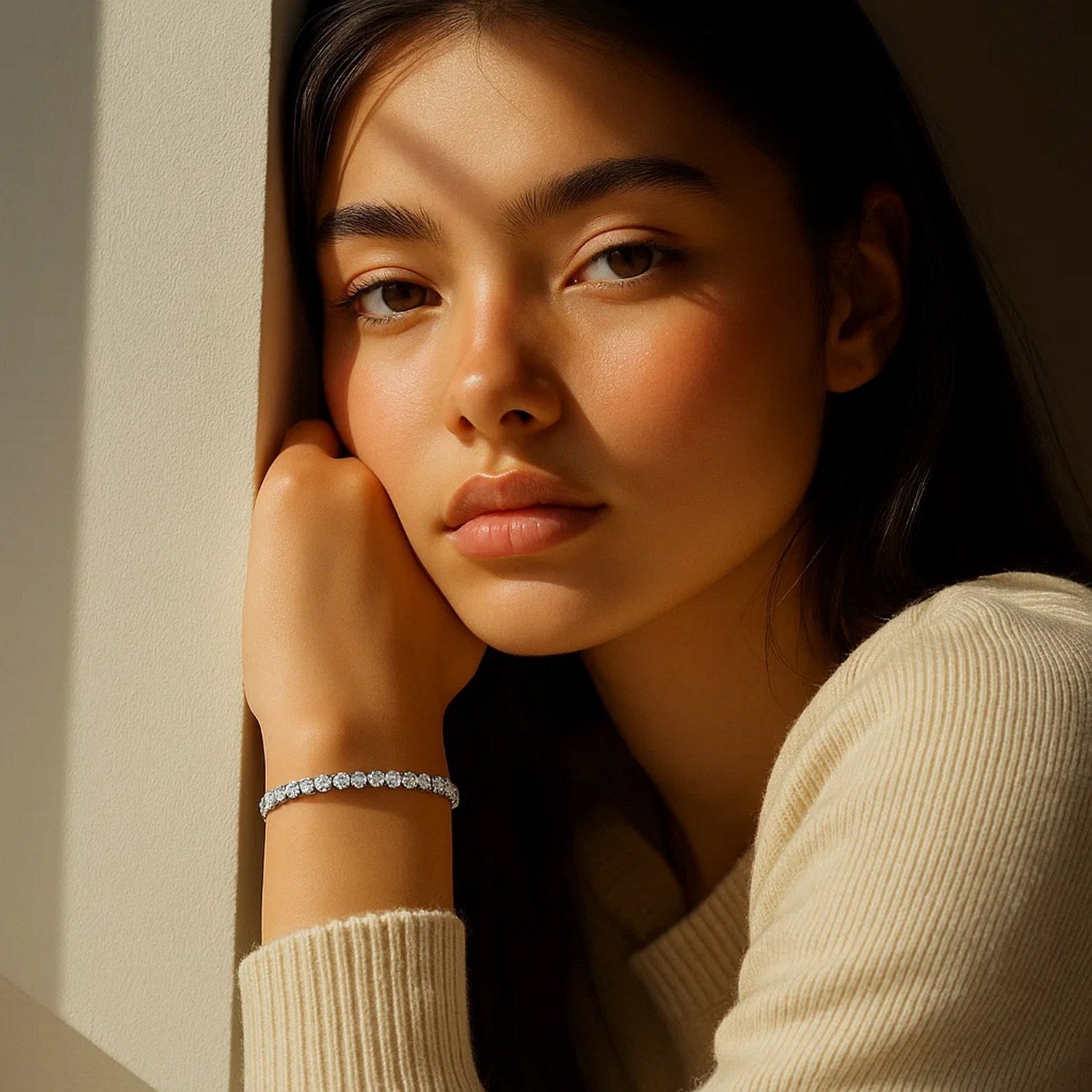 Classic four prong 3 carat total weight diamond tennis bracelet showcasing perfectly matched brilliant round cut lab grown diamonds set in 14k white gold.